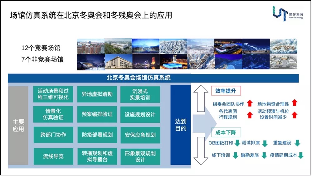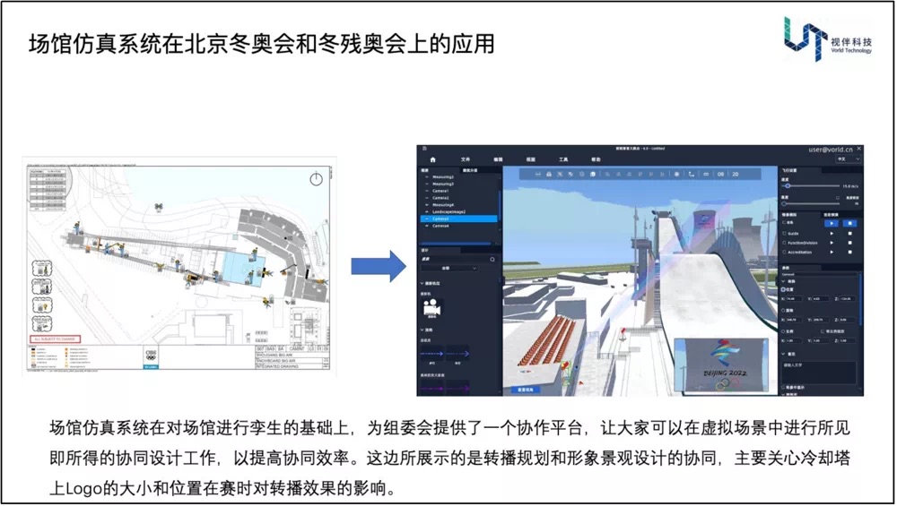 视伴科技CEO韩坚在论坛中介绍了“场馆仿真系统”在北京冬奥会和冬残奥会上的应用,该系统在对场馆进行孪生的基础上为组委会提供了一个协作平台,让大家可以在虚拟场景中进行所见即所得的协同设计工作,以提高协同效率,同时对系统中转播规划和形象景观设计的协同进行了展示。“场馆仿真系统”的应用范围覆盖了12个竞赛场馆和7个非竞赛场馆, 除了赛事组织过程中典型的分区和流线规划设计,还包括异地虚拟踏勘、沉浸式的实景培训、情景化仿真验证等功能应用,对赛事组织的效率提升和成本下降起到了重要作用。